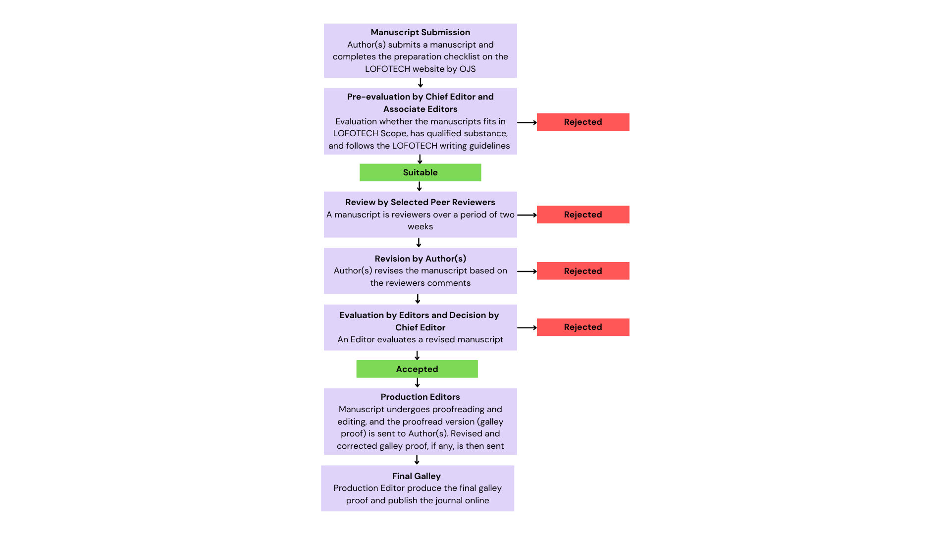 - Pre-evaluation: Manuscript received by Technical Editor, will be checked for its compliance with the LOFOTECH format standard. Manuscripts not meeting the writing format standard will be returned to Author(s), while suitable manuscripts will be forwarded to Chief Editor and Associate Editors. Chief Editor and Associate Editors evaluate the alignment of the manuscript's topic with the scope of LOFOTECH, as well as assess the manuscript's novelty, objective, method, and scientific impact. Unsuitable topics will be declined, while suitable ones will be sent to the reviewers.